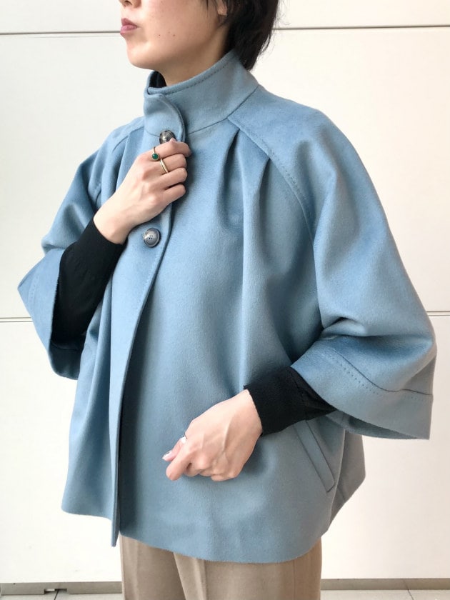 角度によって違う光沢が生まれる肌触りも良い生地は、まるでカシミヤと見紛う美しさ。、更にタックが入る事で着たときの立体感もプラスされます。ショートコートには少し珍しい、立ち襟の上品な佇まいです。
