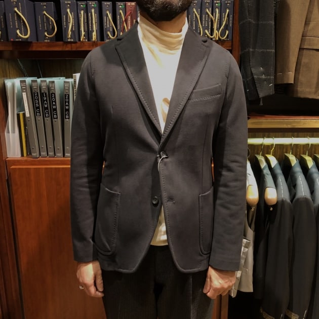 どうしても平面的なペラペラした見た目になりがちだったジャージージャケットを、いかにテイラードジャケット的な立体感に近づけられるかという課題にトライしたモデルです。