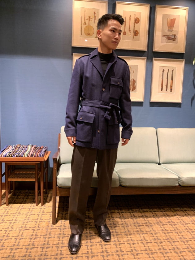 スタッフ森岡がニットの上にサイズ42着用でこのような見え方です。良いですね。<Stile Latino>らしさが感じられるサファリジャケットです。少し着丈は長めのバランスでしょうか。ウエストベルトで少し絞めて頂くと、メリハリが出て綺麗なシルエットをお楽しみ頂けると思います。