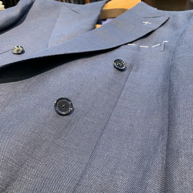 画像ではやけに青く写ってしまいましたが、ネイビーの6ボタンダブルジャケットです。襟幅もそんなに広過ぎず、端正な顔立ちのダブルブレスト。<De Petrillo>らしい上品な雰囲気を感じます。