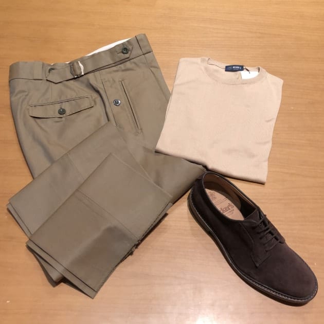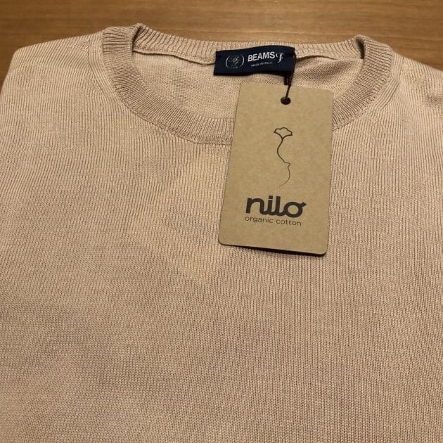 特にIさんも気になるという、ベージュが良いですね。クリーンなキレイなトーンのベージュです。ベージュのニット自体がメンズだとあまり見ない?というか、少なくとも我々の売場では見ないです。こういうくすんでいない、クリーンなトーンのベージュってなかなか無いんですよね。