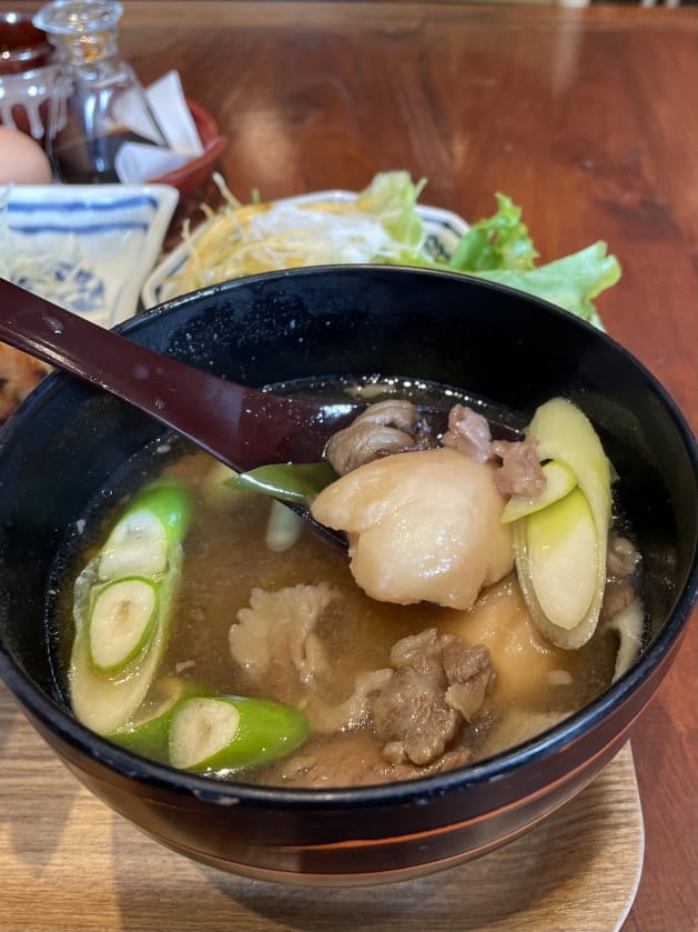 里芋、ネギ、牛肉と白い玉こんにゃくが入った優しいお味の芋煮です。