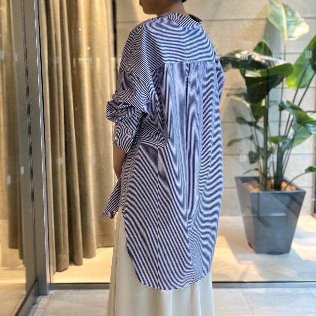 後ろが長めののシャツはバサっと羽織ればコーディネート完成です。細身のパンツと合わせて、着痩せ効果も期待できます。