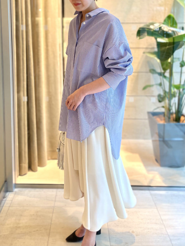 シャツのコーディネートのマンネリ回避に。変形ヘムのフレアスカートを合わせました。画像をクリックして全身のコーディネートもご覧下さい↓
