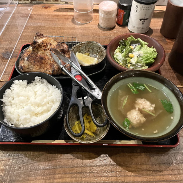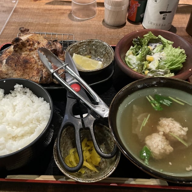 オーダー後すぐに到着した鶏もも肉の炭火焼き定食。何よりトングとハサミのインパクトにびっくり!