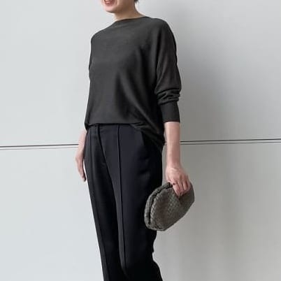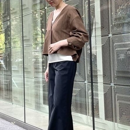 まずは着用シーンを選ばないシルク100%のトップス。適度な光沢がありタックインでもアウトでも様になります。今回はちょこんとサテン生地のパンツにタックイン。スタイリングは画像クリックで飛びます↓