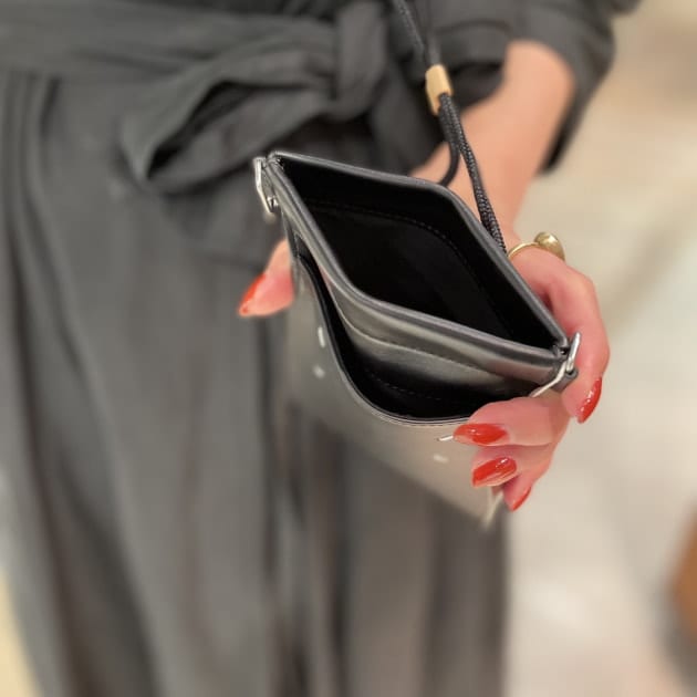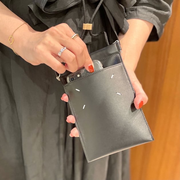 まずはこちらのiPhoneポーチから、携帯をバックからいちいち出すのがめんどくさい。バッグを持たずにチャチャっと出かけたい時に便利。両手が空くのが嬉しいですよね‥