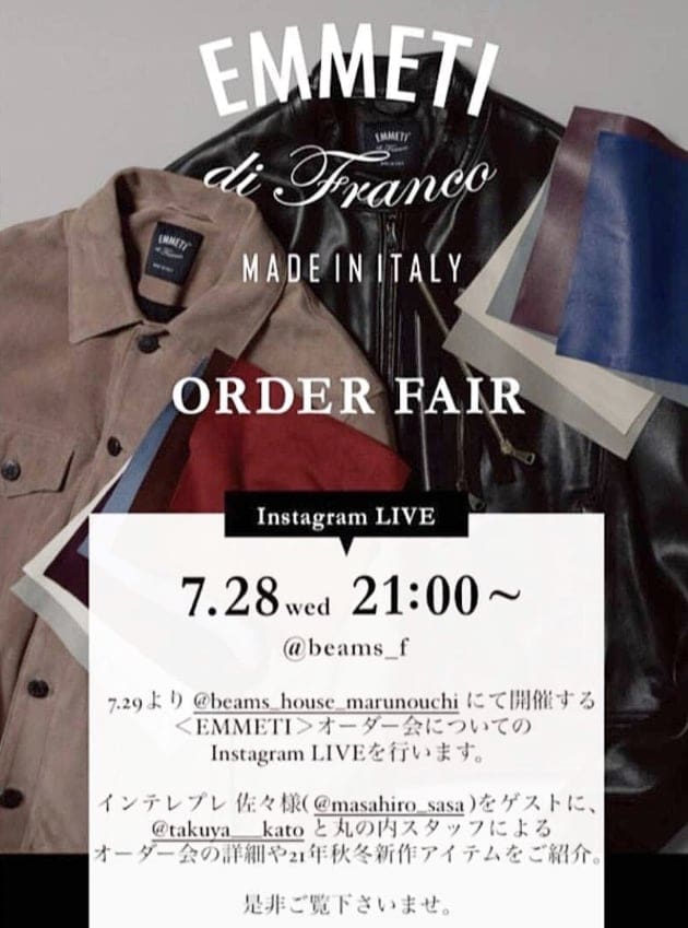 昨日のブログで<EMMETI>オーダーフェアのインスタライブが当店からあるとお伝えしてしまいましたが、発信するアカウントはBEAMS Fアカウントからでした。