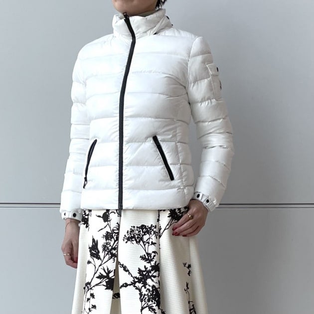 お次はフードの取り外しが可能なショートタイプ。冬の白も良いですよね‥こちらはフードを外して着用しています。ツヤのあるコンパクトなショートダウン、"BADY"(バディ)