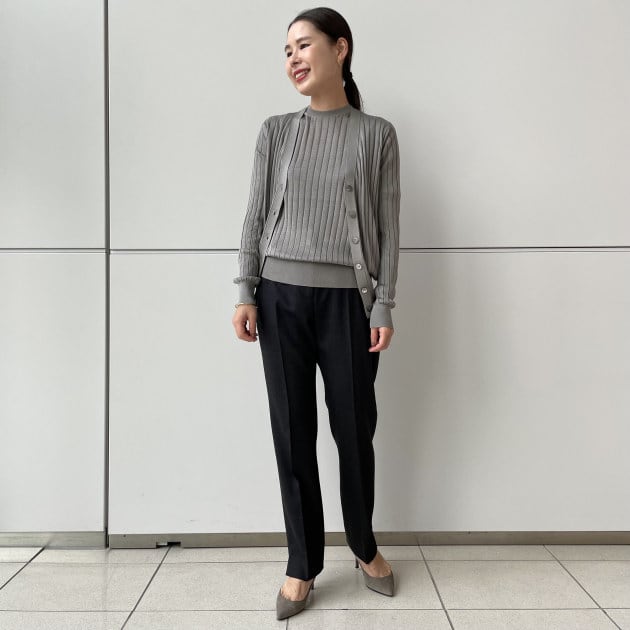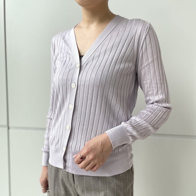 ISHIHARA着用の18ゲージの細い糸で編み上げた光沢のあるシルクリブニット。肌触りも良くリピーターも多い人気アイテムです。こちらはカーディガンと半袖のニットと合わせてお召しいただけます