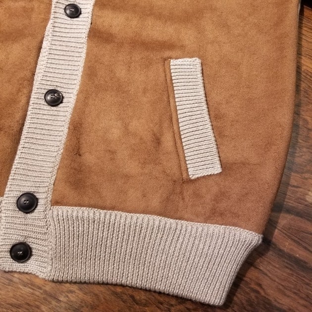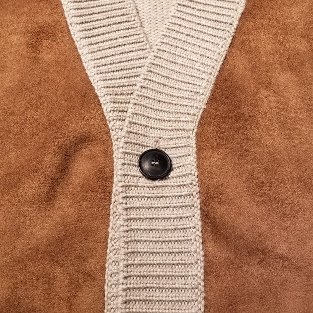 本革ではないですがリッチに仕上がっているアルカンターラのコンビカーディガンいかがでしょうか。