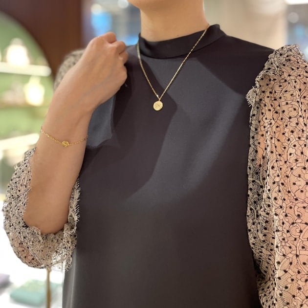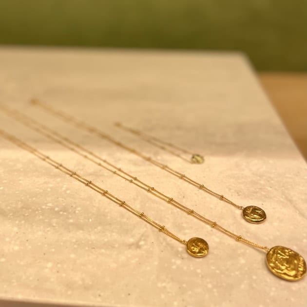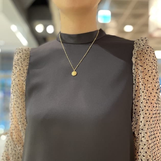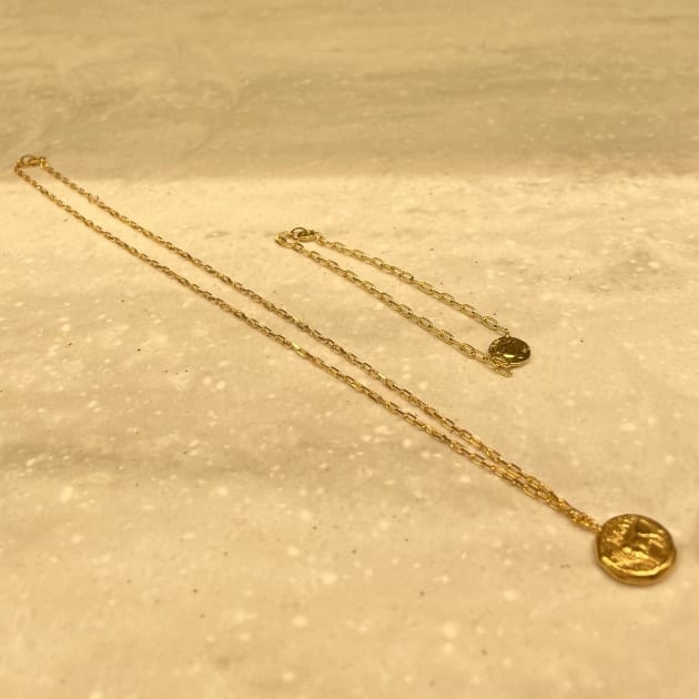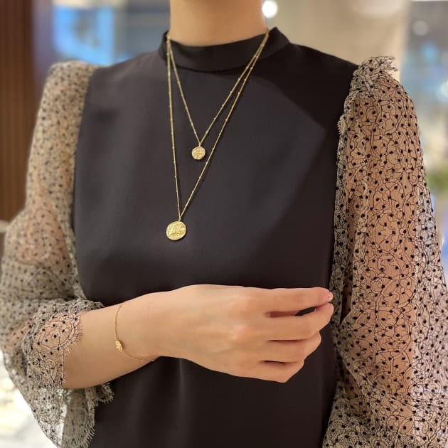 異国で使われたいたコインモチーフを使用した"Ancient Memories"華奢なデザインですが、神秘的な魅力を秘めたコインと光るチェーンが華やかで美しい胸元を演出します。とても軽いのでデイリーにも、重ね付けも適しています