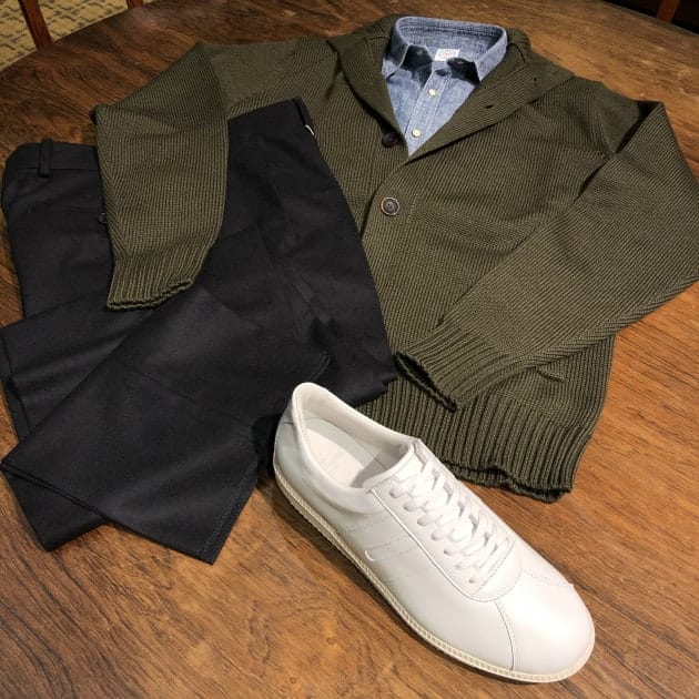 レザーのスリッポンやブーツでもOKですが、ディレクターNISHIGUCHIイチオシの白いレザースニーカーを合わせたり