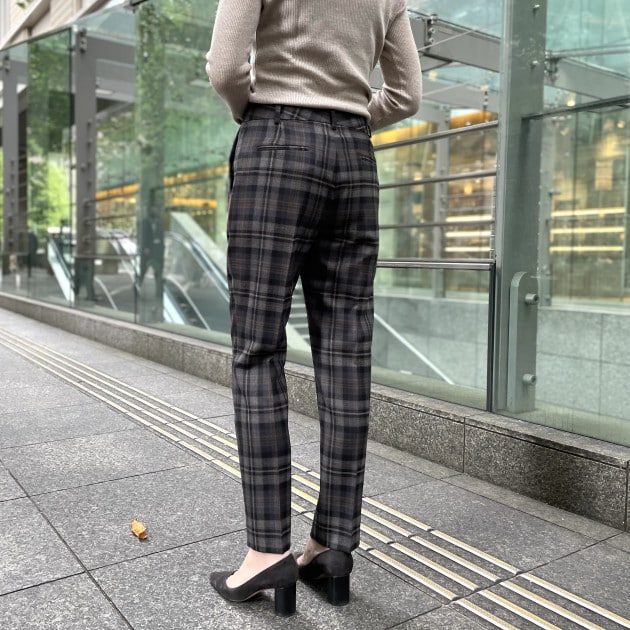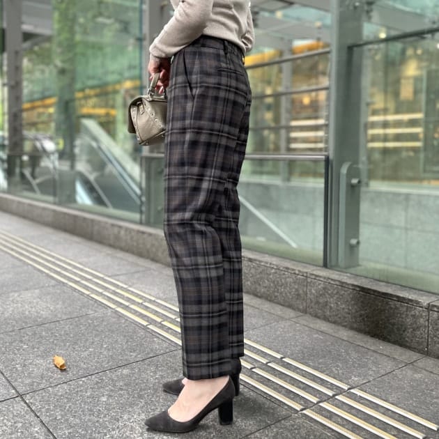 腰回りはすっきりとしたノータック。先細りのなだらかなテーパードシルエットはトップスも選びませんね‥