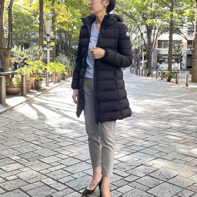 真冬でも安心の長すぎないレングス。高めのウエスト位置で後ろ姿がスッキリ&スタイルアップが叶います。本日のタイトルは"背中で語る、MONCLER"ですからね‥
