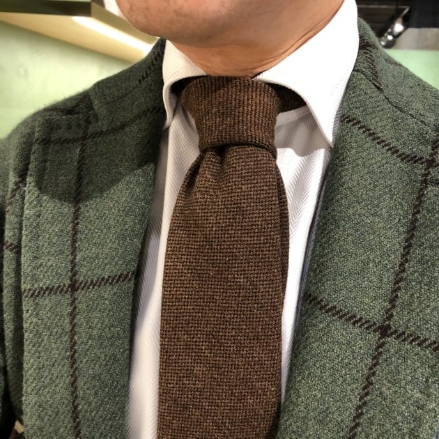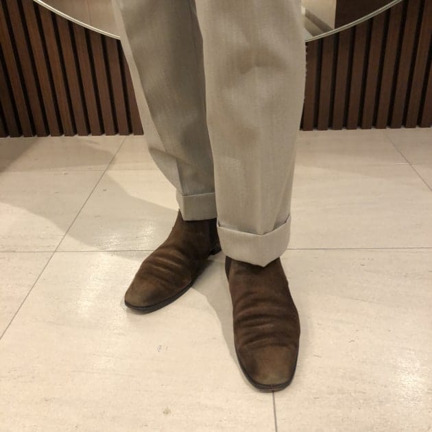 白いシャツにブラウンのウールタイ、ベージュのパンツ、スエードのチャッカブーツ