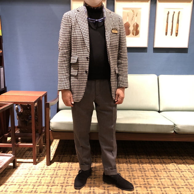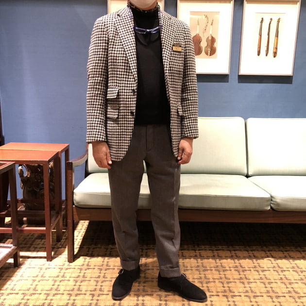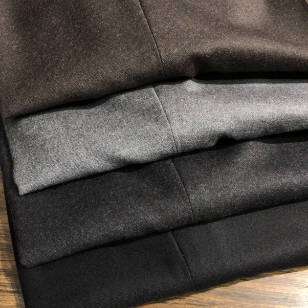 グレー系2色の汎用性の高さはもちろんですが、ブラックやダークブラウンをニットやレザージャケット、ダウンなどにキレイめなカジュアルで合わせていただくのが個人的にはオススメです。