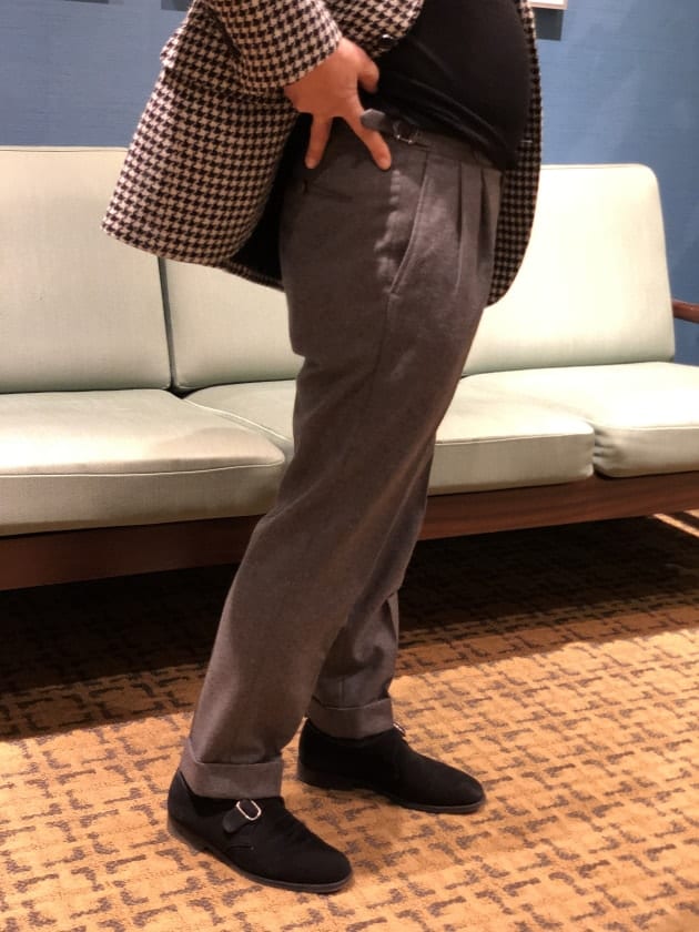 とオンラインの説明がよくまとまっていたので、そのまま引用しましたが、2プリーツながら、全体の印象としては程良くスッキリと感じるシルエットが長年ご好評いただいております。