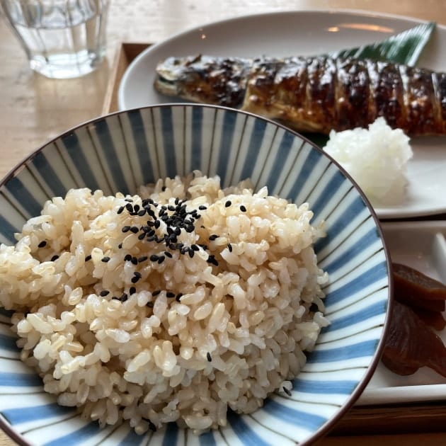 香ばしい玄米には、お好みで卓上の黒ゴマや塩をかけてお召し上がりください。ゴマ好きなのでゴマかけています