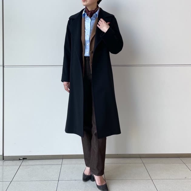 少し長めに設定されたジャケットは、縦のシルエットを強調してすっきりスタイルアップが叶います。くるみボタンもアクセントに。今回はカシミヤコートを羽織ったエレガントなコーディネートに仕上げました