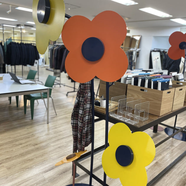 可愛らしい展示会会場の鏡にはLARDINIのアイコン、花形のブートニエールがちょこんと並んでいます。