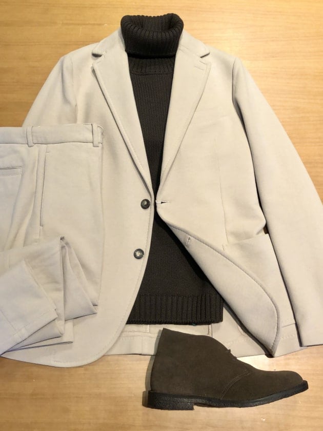 革靴を合わせる場合は、柔らかい印象、よりカジュアル感が伝わる雰囲気のモデルの方がジャケットのジャージー素材とのマッチングが良いと思いますのでオススメです。
