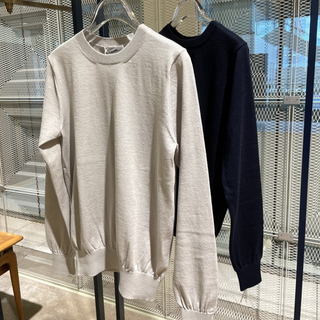 お次はこちら、撥水性に優れたポリエステルとコットンをブレンドした糸で丁寧に編み立てられた柔らかな風合いのクルーネックニット。こちらのネイビーはスペシャルな別注色。サイズ2を着用しています