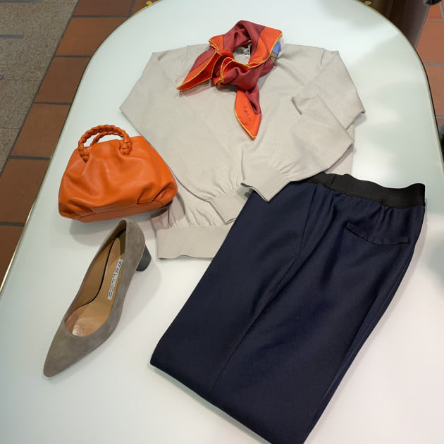 SLOANEのニットでこんな春めいたコーディネートはいかがでしょうか?