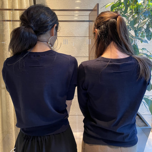 撥水性に優れたポリエステルとコットンのブレンドした糸で丁寧に編み立てられた柔らかな風合いのニット。こちらも2人ともサイズ1を着用しています。こちらにはSLOANEのアイコンのステッチが後ろの襟元に施されています‥分かりますか?さりげないワンポイントに