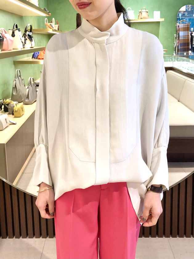 ストールでおなじみの〈Faliero Sarti〉の生地を使用したボザムシャツ。特殊な織り組織なので存在感のある一枚です。着丈は腰回りが隠れるくらいの長さなので、パンツとの合わせたエレガントなスタイリングがおすすめ。