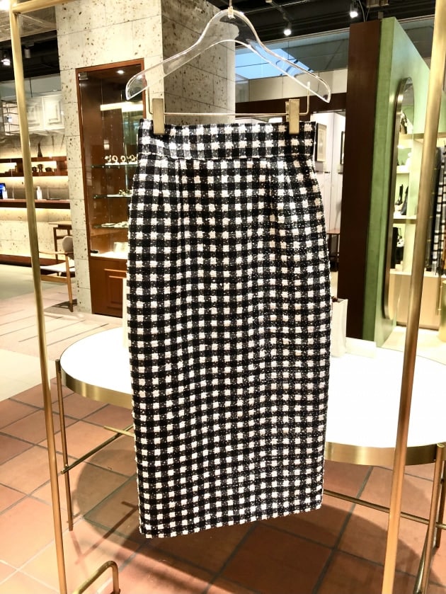 イタリア コモのCarlo Pozzi社のギンガムチェック素材を使用。ハイウエストで太めのウエストベルトがクラッシックで女性らしいシルエットのタイトスカートです。