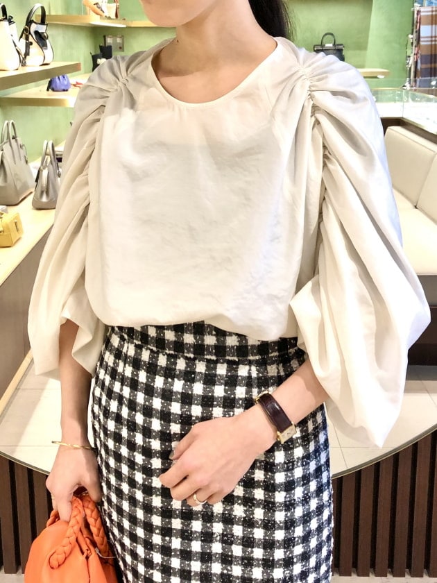 ギャザーが贅沢に入ったデザインが魅力の一枚。ボリュームスリーブながらいつもとは表情が違いますよね。シルクライクなお手入れしやすいポリエステル素材(手洗い可)も嬉しいポイントです。