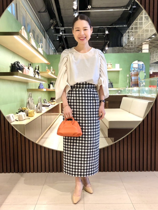 ギンガムチェックのツイードスカートが主役になる、クラシカルな印象のスタイリングです。