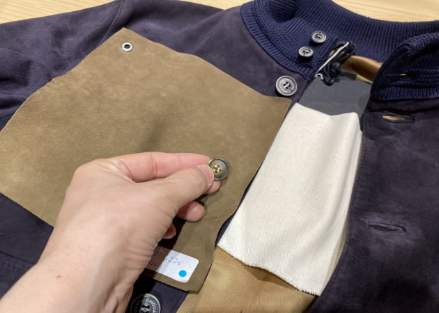 ホーンボタン(ロゴ入り、ロゴなし)、白蝶貝ボタン、樹脂ボタンからテイストに合ったものをお選び頂きます。