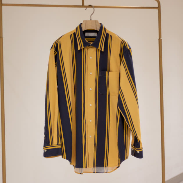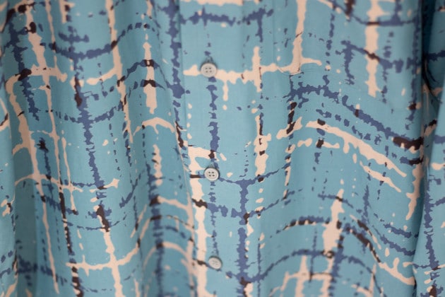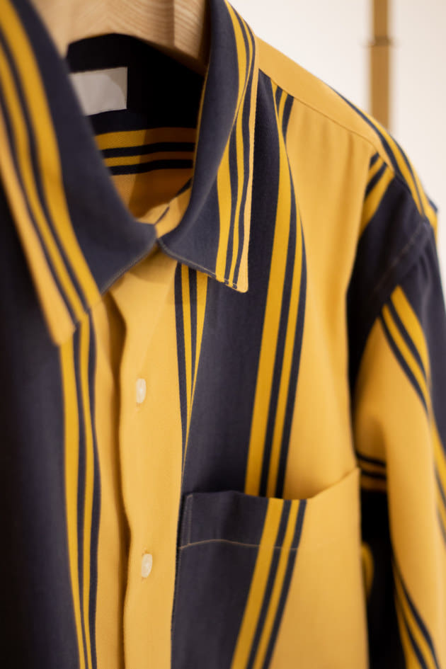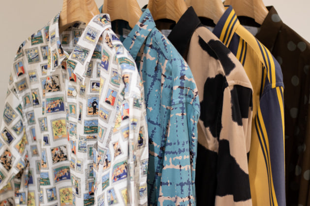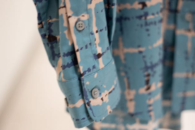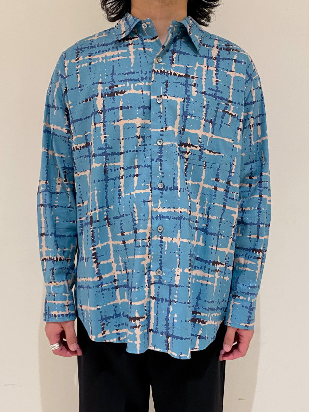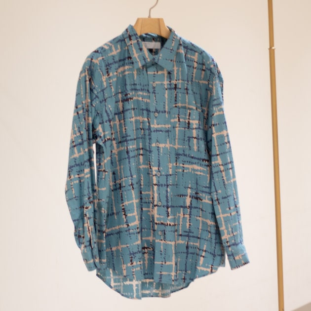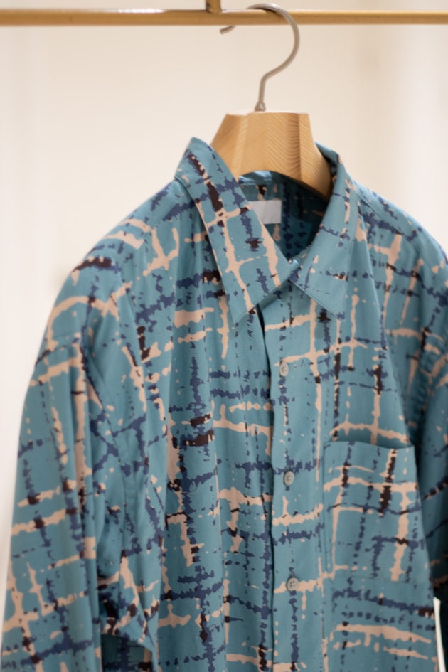 ハリと光沢のある品の良い生地にアブストラクトな柄をのせたインパクト抜群なシャツです!