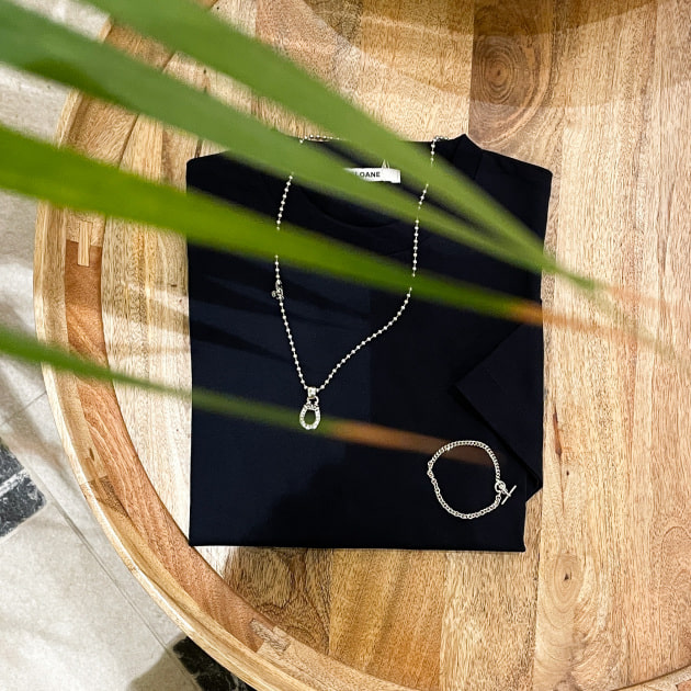 Tシャツが活躍するシーズンにはネックレスやブレスレットでアクセントをつけると、着こなしの楽しみ方も広がります。