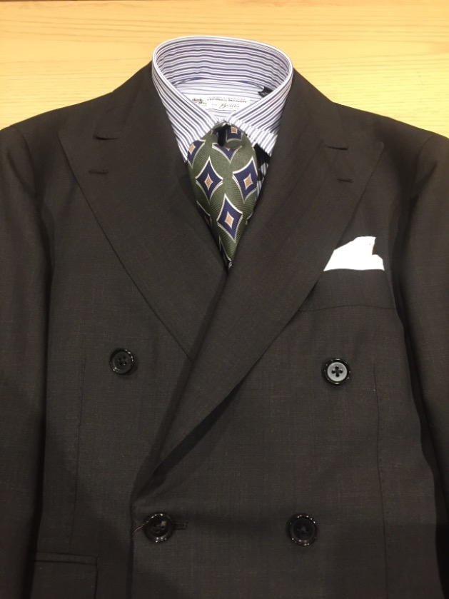 BROWN SUIT 伊藤 大史 2018.02.08 こんにちは、伊藤です。新作が揃い始め、店内は春めいてきました。来週はスタッフは衣替えの時期のため、何を着ようかと考えていることでしょう… 僕もその一人です。まずはスーツをビシッと着たいので、候補の一着でコーディネートしてみました。ブラウンに薄っすらとネイビーのストライプが入った生地です。地味になり過ぎないよう春らしいグリーンのタイを合わせてみました。やや大きめのダイヤ柄のプリントタイです。段々と春にしたいスタイリングのイメージが固まってきました。早く暖かくなってほしいです!