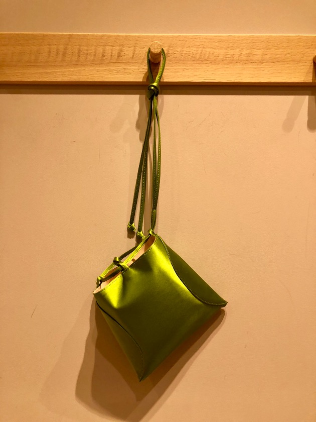 こちらのショルダーバックは光沢のあるシルク100%の生地でできており、特徴的なシルエットをしており、ピローボックスと呼ばれるジュエリー用のギフトボックスの形から連想されてます!
