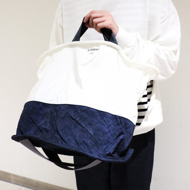 バッグは、廃材として捨てられているエアバックを使用し、船舶で使われているランドリーバッグをイメージソースに製作されたバケットバッグです!