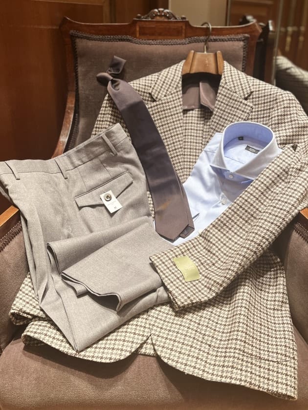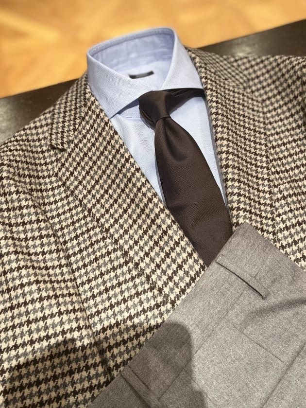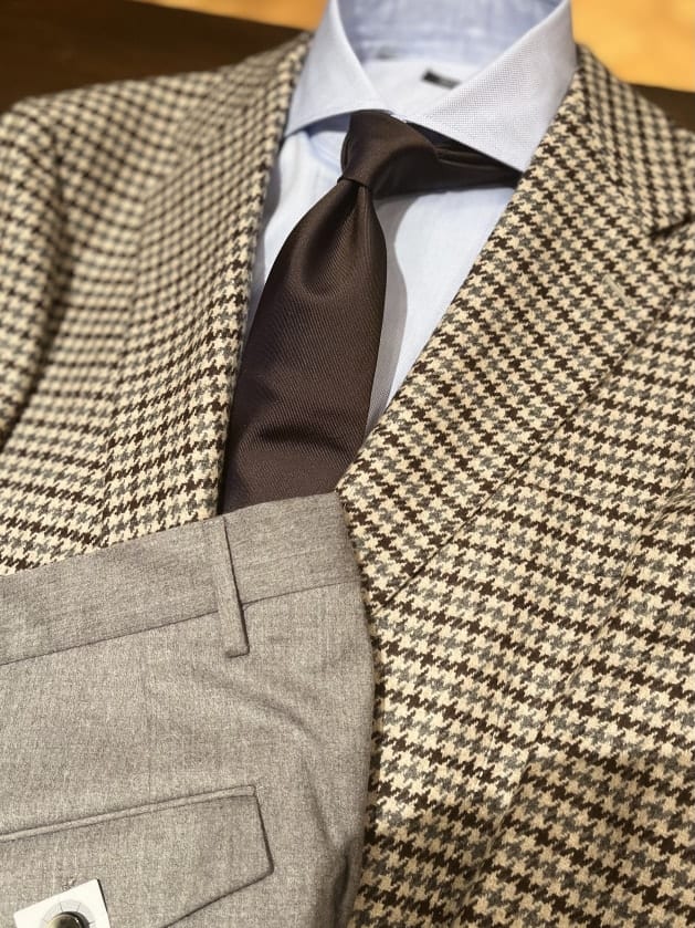 ジャケットの生地質を損なわないようにシャツとネクタイの素材感に注意が必要ですかね。