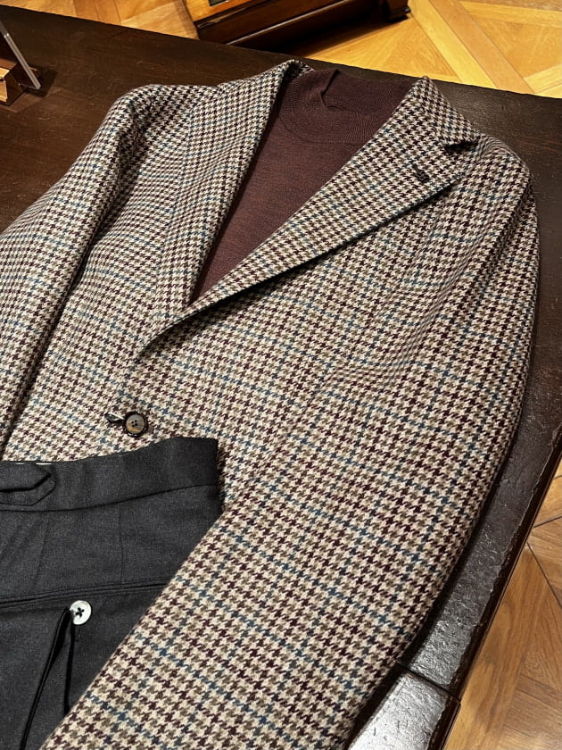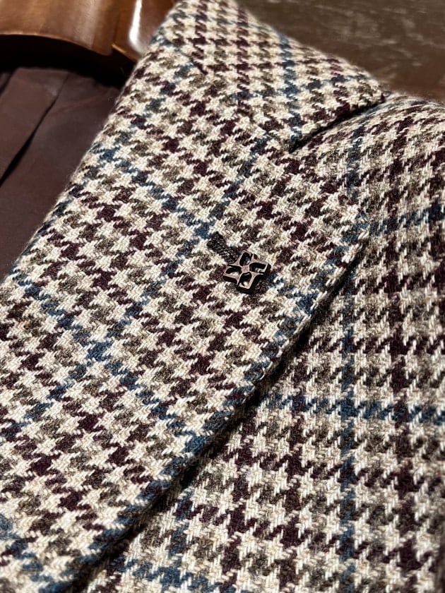 こちらのジャケットのオススメポイントとしては、ガンクラブチェックならではの多色使いしたこの生地です。英国調の柄ですが、今の気分を反映したようなターコイズがあったり、少し艶っぽさを感じさせるようなボルドーが入っていたり、野暮ったさはなくどちらかというと綺麗目な感じで着用いただけるジャケットなのかなと思います。