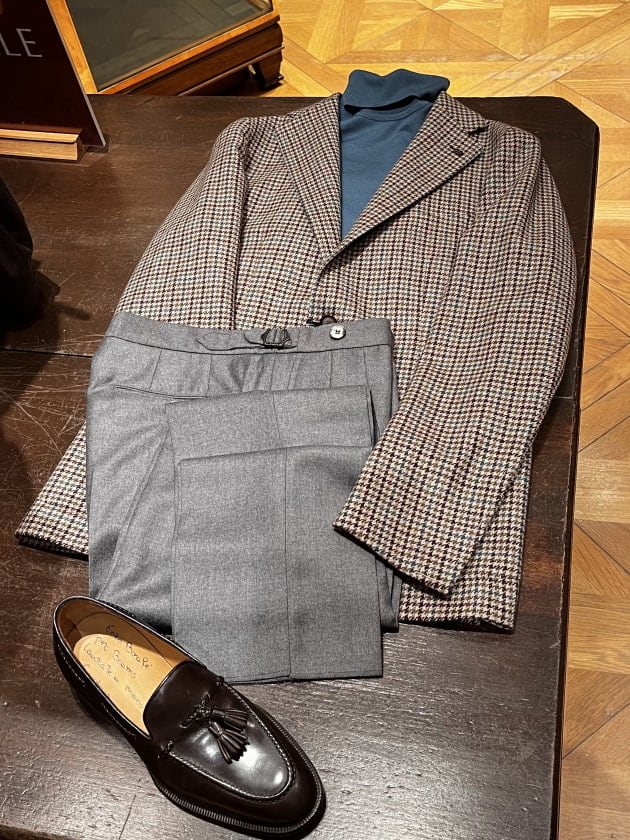 オーソドックスなスタイルです。タートルネックニットでジャケットの色を拾っております。この手のコーディネートは好みはあると思いますが、シンプルでストレートな合わせ、私は嫌いではありません。