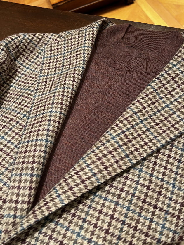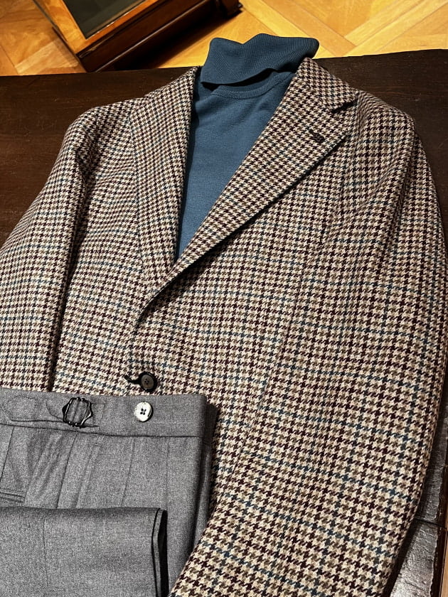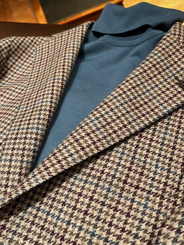 こちらのジャケットのオススメポイントとしては、ガンクラブチェックならではの多色使いしたこの生地です。英国調の柄ですが、今の気分を反映したようなターコイズがあったり、少し艶っぽさを感じさせるようなボルドーが入っていたり、野暮ったさはなくどちらかというと綺麗目な感じで着用いただけるジャケットなのかなと思います。