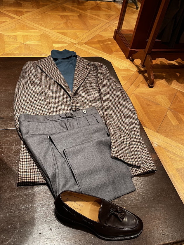 オーソドックスなスタイルです。タートルネックニットでジャケットの色を拾っております。この手のコーディネートは好みはあると思いますが、シンプルでストレートな合わせ、私は嫌いではありません。