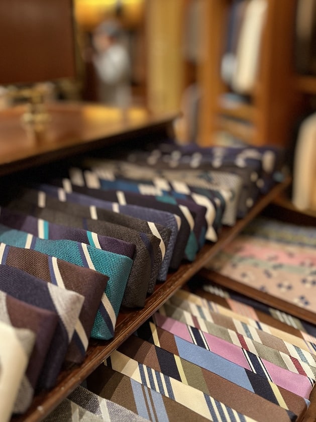 レジメンタルストライプはもちろん、小紋柄も様々な種類をご用意しております。私の好きなペイズリー柄も良い物がありまして本当に充実しているなと感じます。