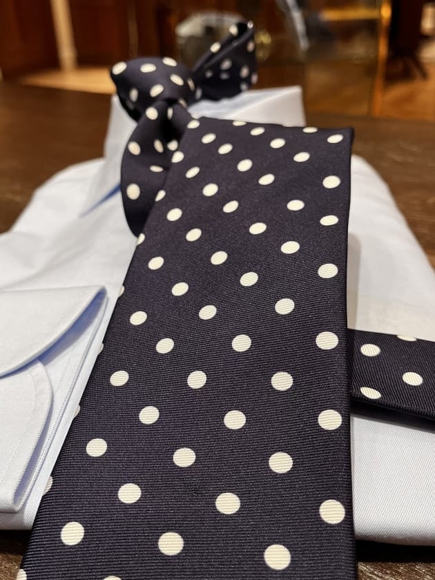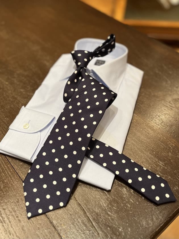 こちらは、〈Holliday& Brown〉のネイビードットタイです。目新しい物ではなく、かなりベーシックなネクタイですが私の好きな物ということで。
