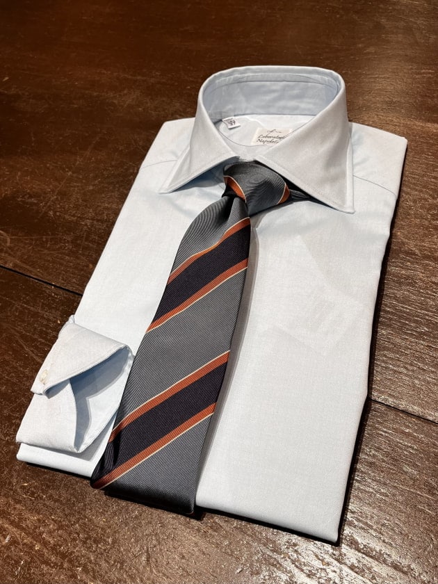 せっかくですので、春夏の新作ネクタイを何本かあててみました。