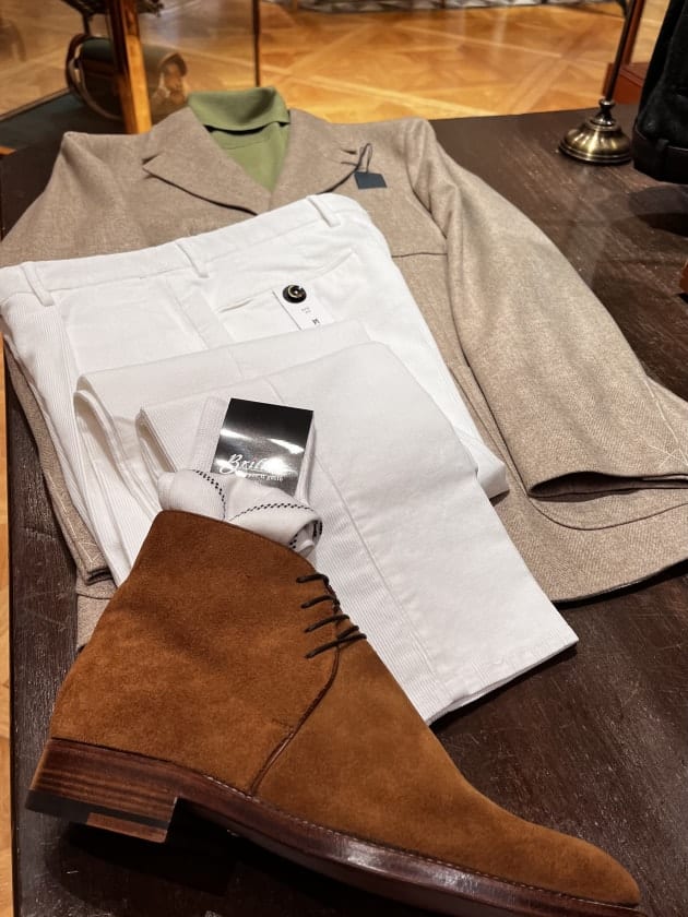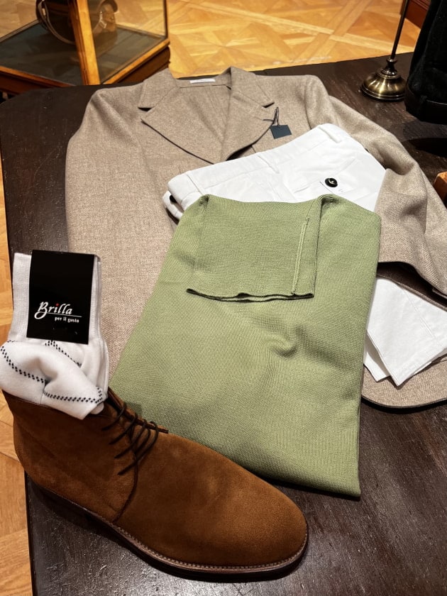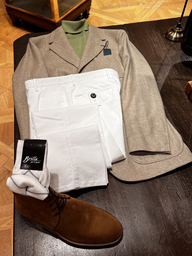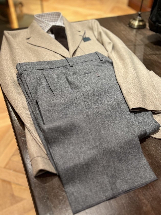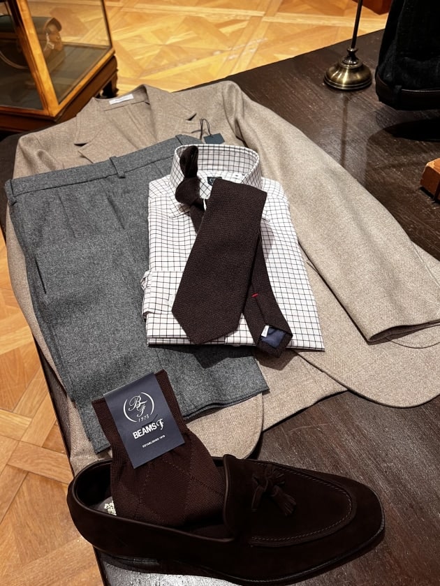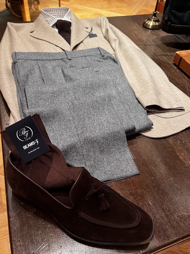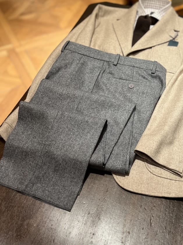 スラックスもジャケットのテイストに合わせてフランネルを。あとは濃いGREYにせずBEIGEの明るさと自然に繋がる様にしてあげるだけです。