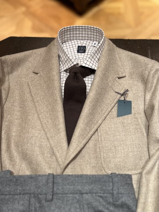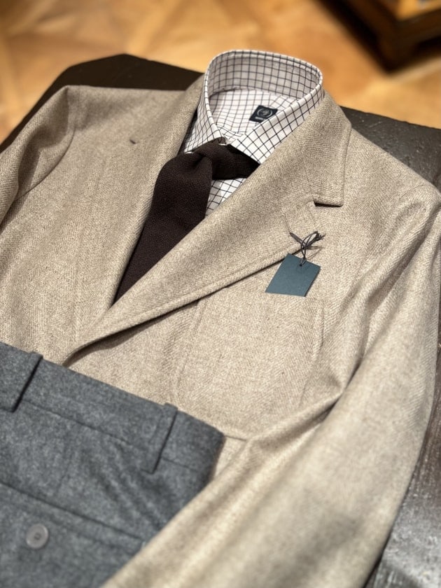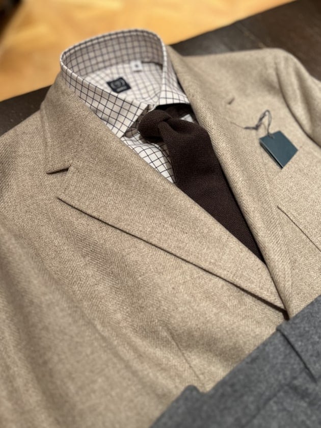 ジャケットは3パッチポケットでスポーティな雰囲気であるということ、英国的な雰囲気も若干感じるということでシャツはタッターソールを。ネクタイもジャケットの生地と素材感が近い物を。やり過ぎない程度にほんの少しカントリーテイストを表現してみました。