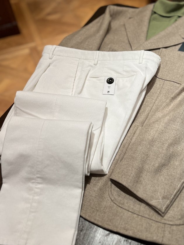 素材、季節、そして色合わせの観点からWHITEのコーデュロイパンツはいかがでしょうか。秋冬の白パンも最高です!